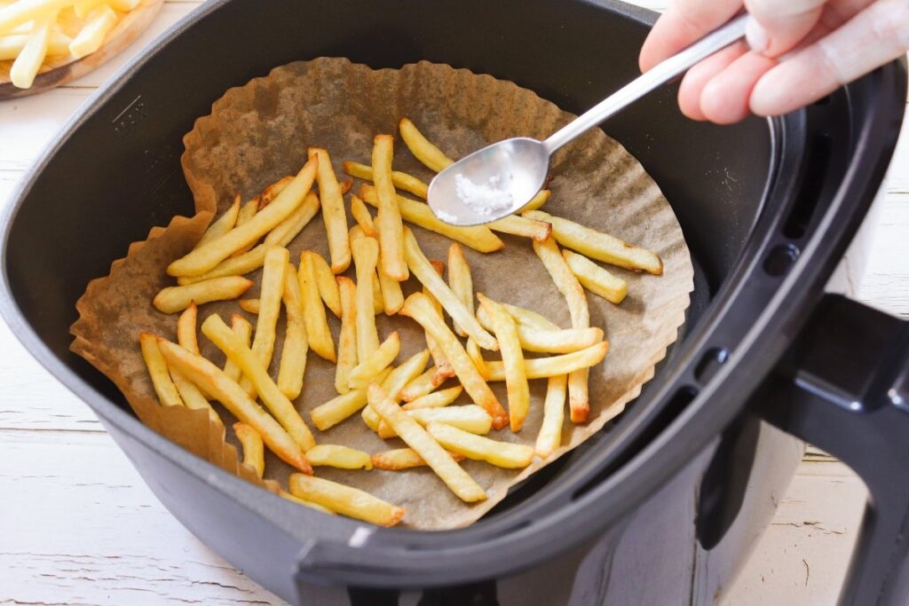 Finalmente, cuando las patatas estén doradas y crujientes a tu gusto, retíralas, añade sal u otras especias al gusto y ¡listo! Tienes unas deliciosas patatas fritas sin nada de aceite.