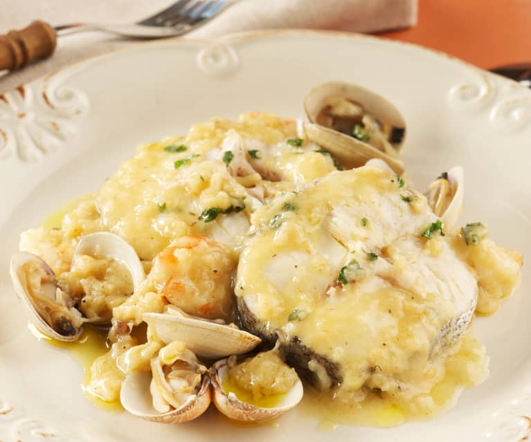 Merluza en salsa verde con gambas y chirlas Thermomix