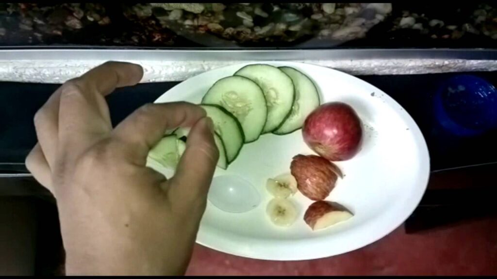 - Calabacín o pepino: Cortados en rodajas finas y ligeramente hervidos. Déjalos flotar en el acuario.