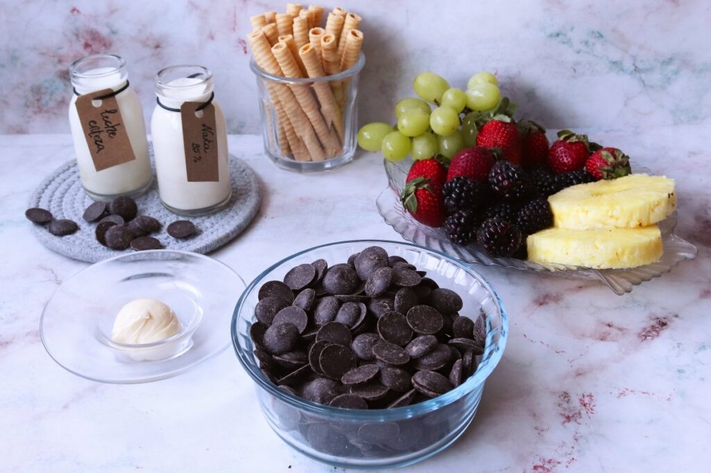 El chocolate es el rey de la fiesta en una fondue, y no es solo una cuestión de deleitarse. La calidad, la cremosidad y el sabor son decisivos para que tu combinación de frutas, galletas y otros acompañamientos brille como una estrella fugaz en el cielo culinario. Sin un buen chocolate, la fondue puede convertirse en un simple remojador de tal cual.